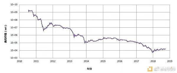 图1. 美元相对比特币价格(单位:1聪 = 0.00000001比特币)