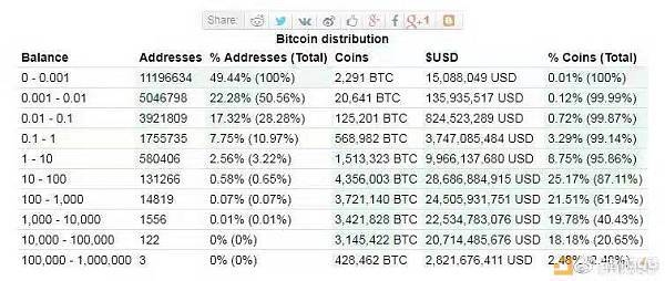 图2. 比特币地址余额分布(数据源:bitinfocharts.com)