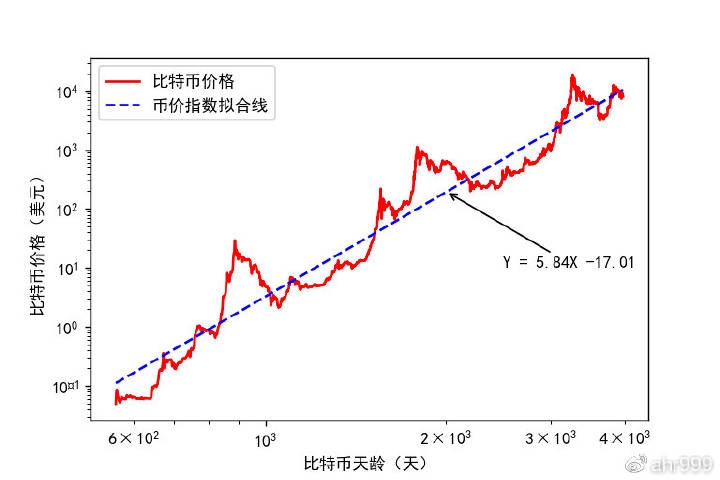 这个图是币价对币龄的图,都是对数坐标。币龄就是比特币出生了多少天(比特币的生日是2009年1月3日)。我们发现,在这张图上,币价对币龄呈现线性关系,拟合的结果是Y = 5.84X- 17.01。那么,换回普通坐标,币价和币龄就是指数关系:币价 = 10^[5.84log(币龄)-17.01]。