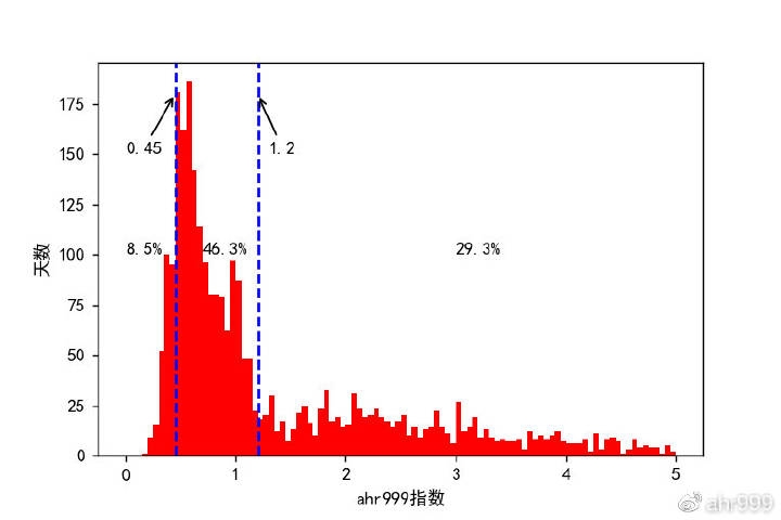我们发现,只有8.5%的时间,ahr999指数小于0.45,这就是抄底区间;有46.3%的时间,ahr999指数在0.45与1.2之间,这就是定投区间;有29.3%的时间,ahr999指数在1.2与5之间,这就是等待起飞的区间。当然,还有ahr999指数大于5的时间,不过我们不准备卖币,所以不考虑了。