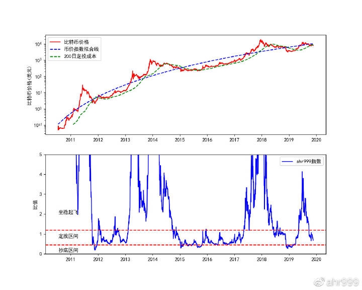 ahr999指数 = (比特币价格/200日定投成本) * (比特币价格/指数增长估值)