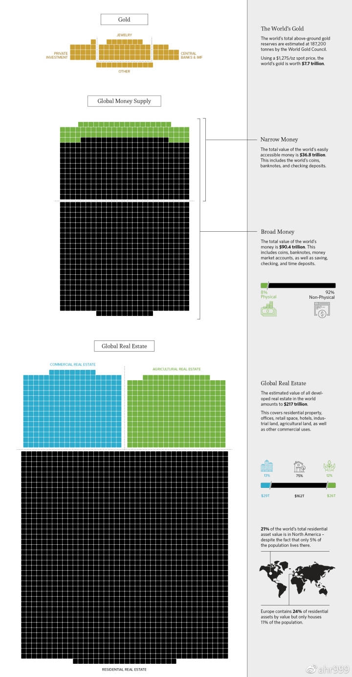 全球黄金的总市值是 7.7 万亿美元,广义货币总量是 90.4 万亿美元,不动产是 217 万亿美元。