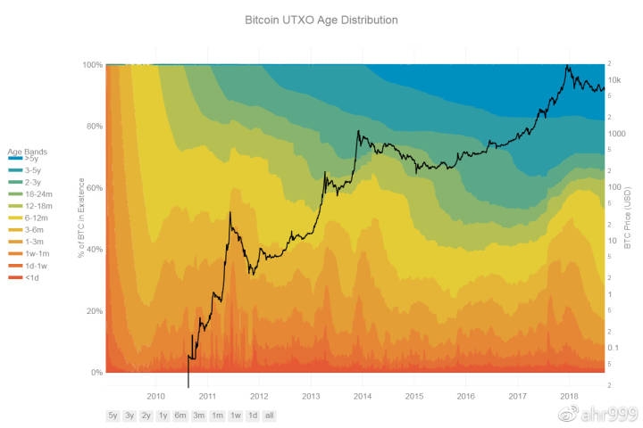图3. 不同币龄比特币的分布比例(数据源http://hodlwave.com/)