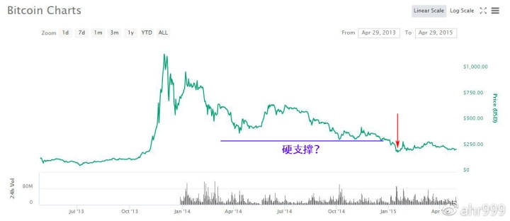 但是,币价还是跌出了大多数人的预期。2015年1月,其实也没什么非常不好的消息,可能某交易所被盗吧。几天之内,币价从2000元就再次腰斩到了900元。